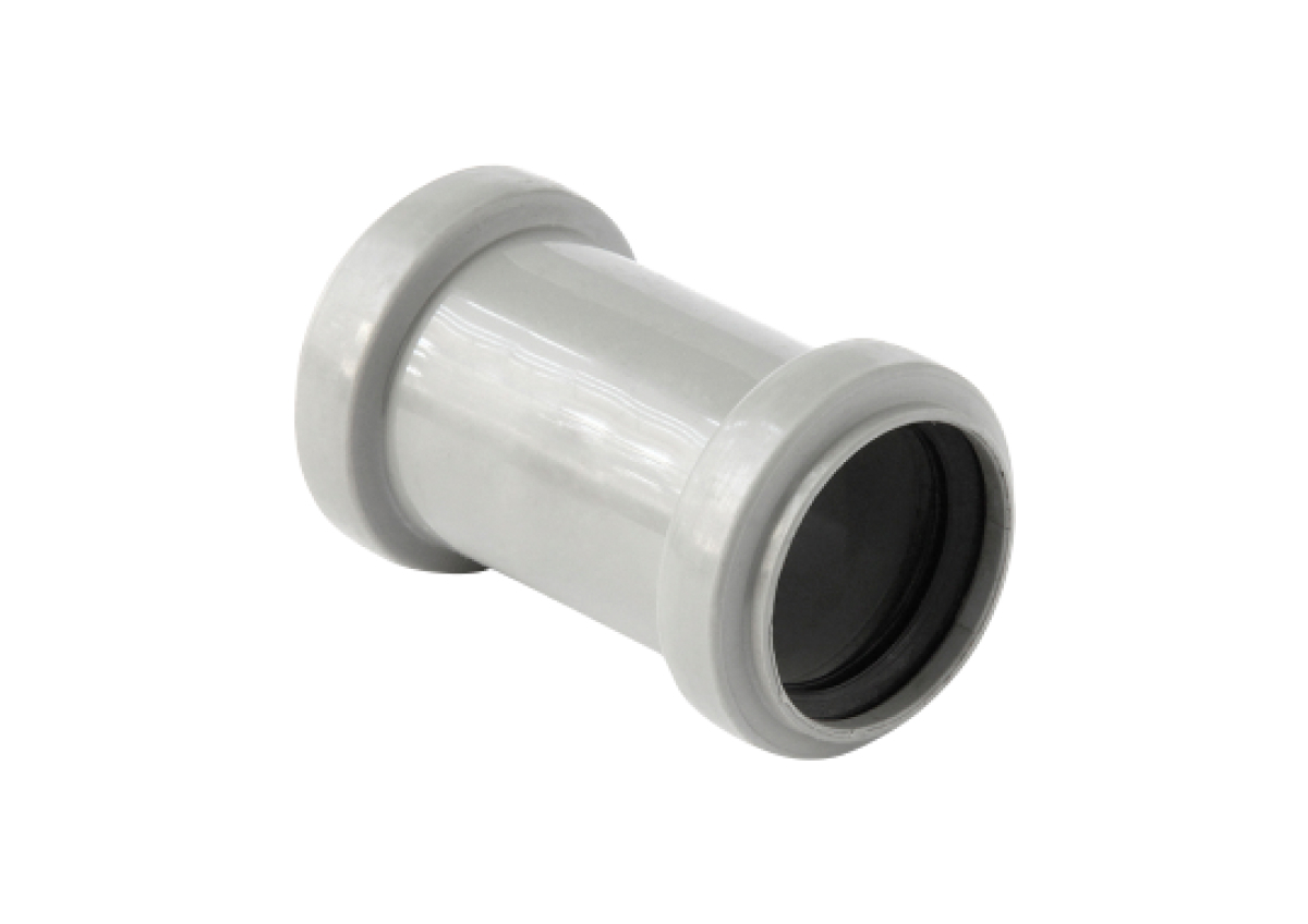 Муфта двухраструбная для внутренней канализации (ремонтная, без перегородки) предназначена для соединения полипропиленовых канализационных труб системы внутренней канализации одного диаметра не имеющих раструб или в случае ремонта трубопровода. Герметичность соединения обеспечивается резиновыми однолепестковыми кольцами установленными в раструб муфты.