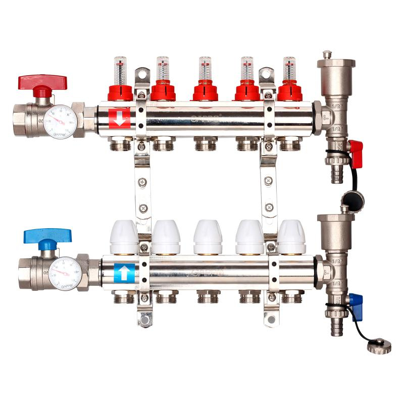 Коллектор регулируемый с расходомерами из латуни - 2 шаровых крана с термометром - 2 воздухоотводчика - 2 сливных крана - 2 кронштейна 5-вых. x1"x3/4" Gappo G421.5