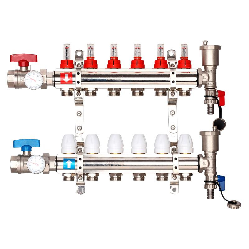 Коллектор регулируемый с расходомерами из латуни - 2 шаровых крана с термометром - 2 воздухоотводчика - 2 сливных крана - 2 кронштейна 6-вых. x1"x3/4" Gappo G421.6
