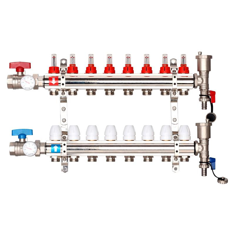 Коллектор регулируемый с расходомерами из латуни - 2 шаровых крана с термометром - 2 воздухоотводчика - 2 сливных крана - 2 кронштейна 8-вых. x1"x3/4" Gappo G421.8