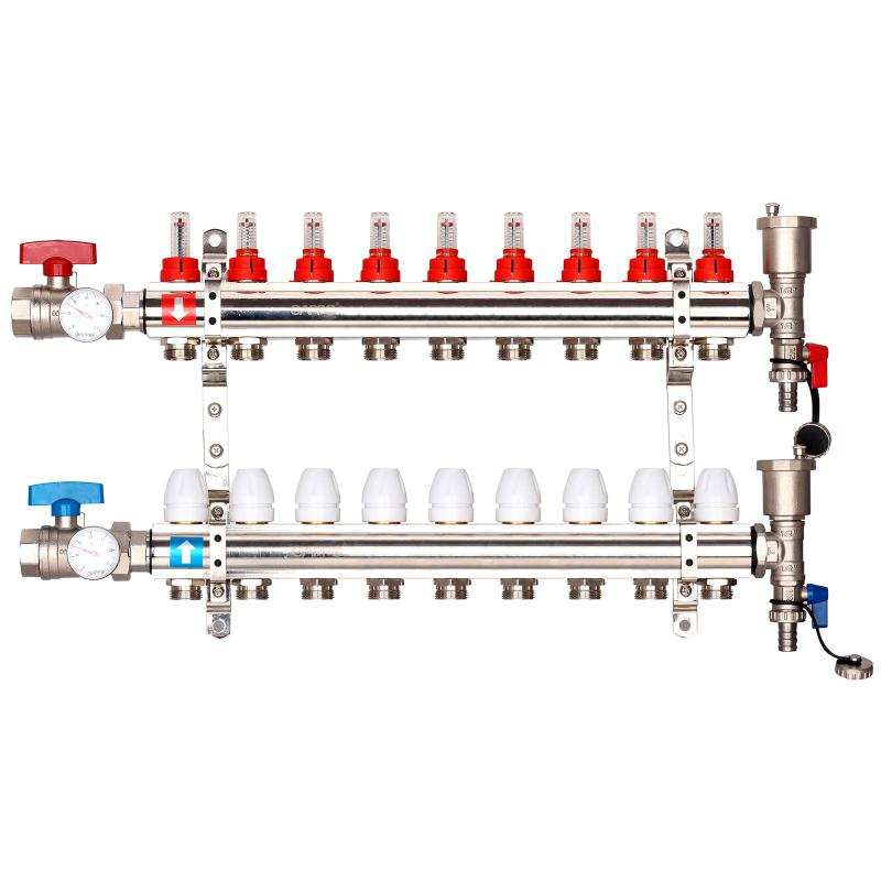 Коллектор регулируемый с расходомерами из латуни - 2 шаровых крана с термометром - 2 воздухоотводчика - 2 сливных крана - 2 кронштейна 9-вых. x1"x3/4" Gappo G421.9