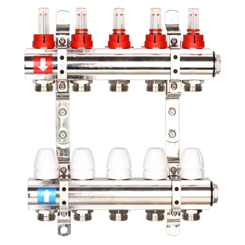 Коллектор регулируемый с расходомерами из латуни - 2 загрушки - 2 кронштейна 5-вых. x1"x3/4" Gappo G423.5