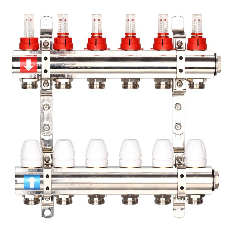 Коллектор регулируемый с расходомерами из латуни - 2 загрушки - 2 кронштейна 6-вых. x1"x3/4" Gappo G423.6