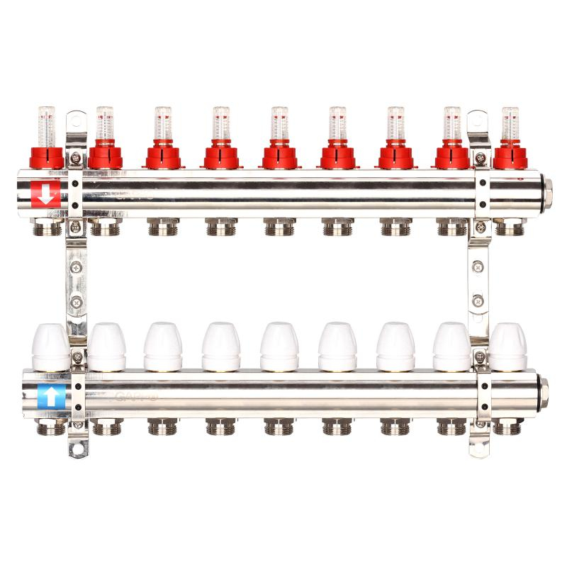 Коллектор регулируемый с расходомерами из латуни - 2 загрушки - 2 кронштейна 9-вых. x1"x3/4" Gappo G423.9