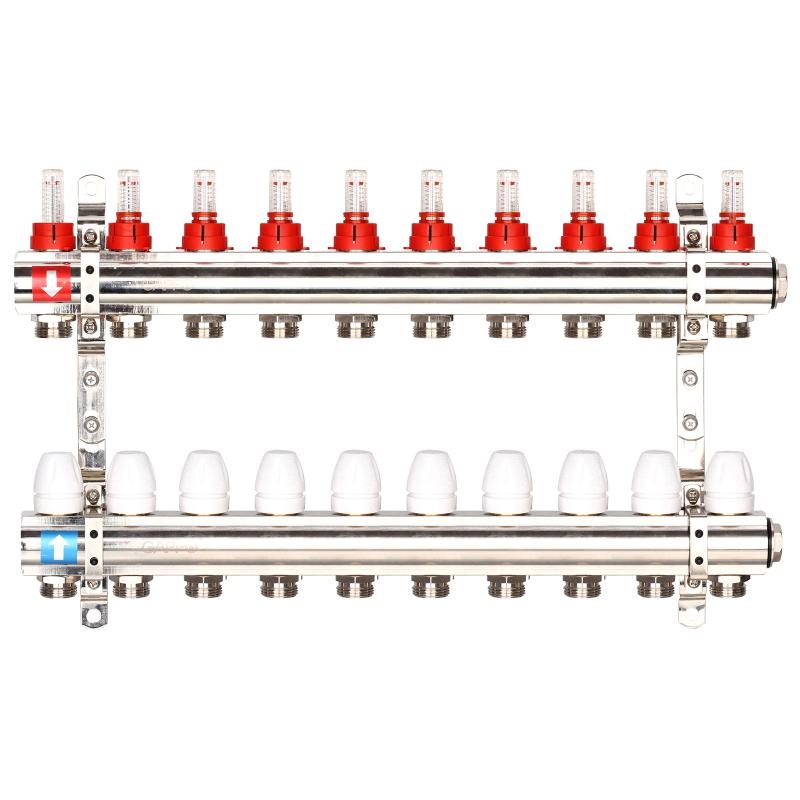 Коллектор регулируемый с расходомерами из латуни - 2 загрушки - 2 кронштейна 10-вых. x1"x3/4" Gappo G423.10