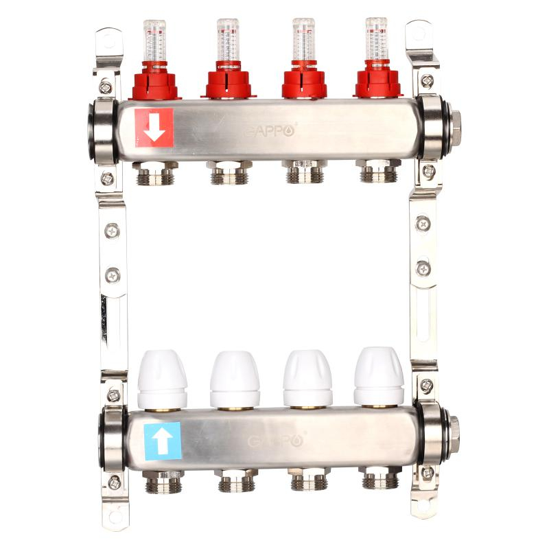Коллектор регулируемый с расходомерами из нержавеющей стали - 2 загрушки - 2 кронштейна 4-вых. x1"x3/4" Gappo G424.4