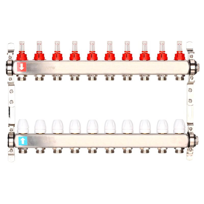 Коллектор регулируемый с расходомерами из нержавеющей стали - 2 загрушки - 2 кронштейна 10-вых. x1"x3/4" Gappo G424.10