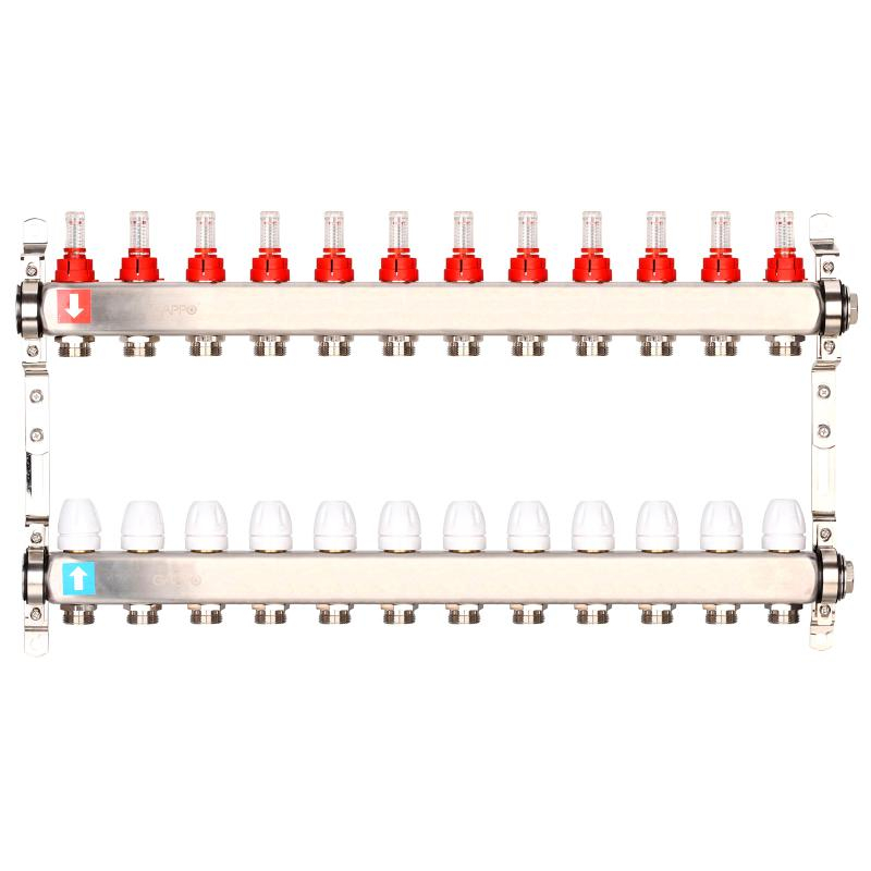 Коллектор регулируемый с расходомерами из нержавеющей стали - 2 загрушки - 2 кронштейна 12-вых. x1"x3/4" Gappo G424.12