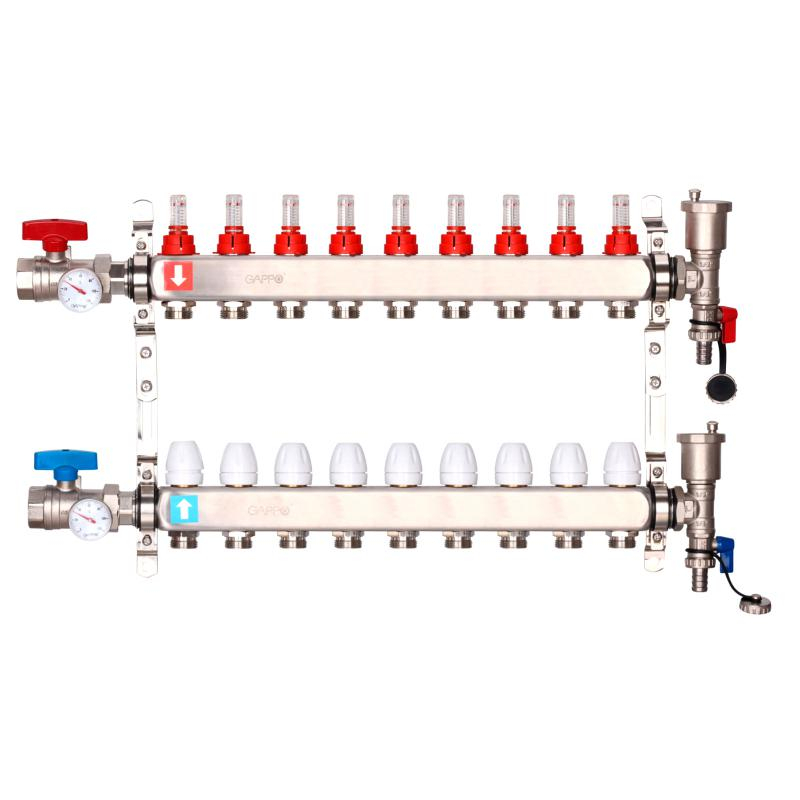 Коллектор регулируемый с расходомерами из нержавеющей стали - 2 шаровых крана с термометром - 2 воздухоотводчика - 2 сливных крана - 2 кронштейна 9-вых. x1"x3/4" Gappo G422.9