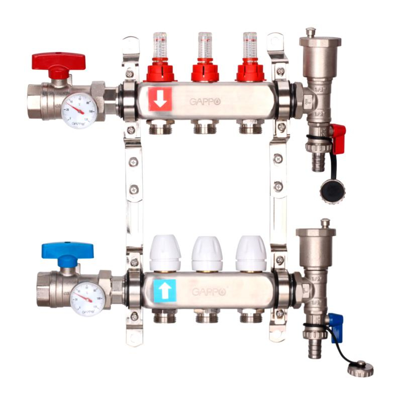 Коллектор регулируемый с расходомерами из нержавеющей стали - 2 шаровых крана с термометром - 2 воздухоотводчика - 2 сливных крана - 2 кронштейна 3-вых. x1"x3/4" Gappo G422.3