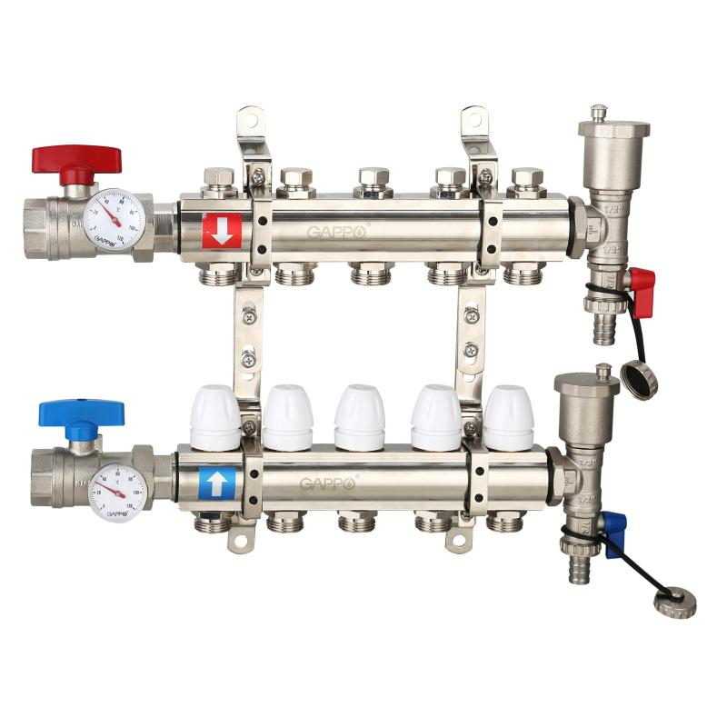 Коллектор регулируемый с запорными клапанами из латуни - 2 шаровых крана с термометром - 2 воздухоотводчика - 2 сливных крана - 2 кронштейна 5-вых. x 1" x 3/4" Gappo G425.5