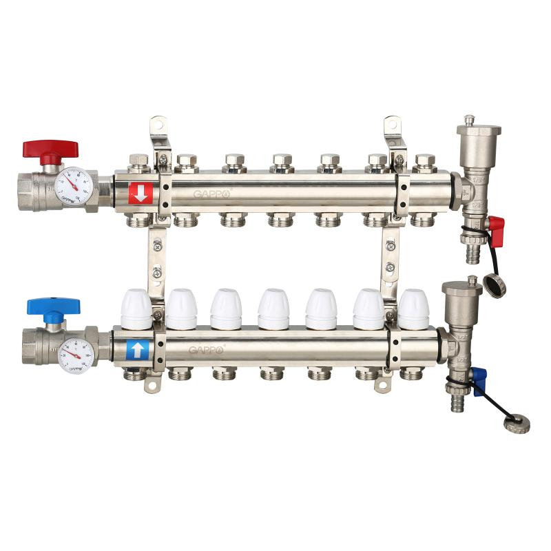 Коллектор регулируемый с запорными клапанами из латуни - 2 шаровых крана с термометром - 2 воздухоотводчика - 2 сливных крана - 2 кронштейна 7-вых. x 1" x 3/4" Gappo G425.7
