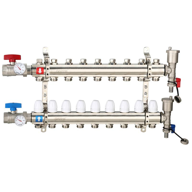 Коллектор регулируемый с запорными клапанами из латуни - 2 шаровых крана с термометром - 2 воздухоотводчика - 2 сливных крана - 2 кронштейна 9-вых. x 1" x 3/4" Gappo G425.9