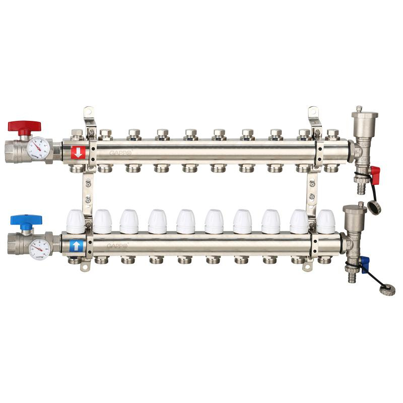 Коллектор регулируемый с запорными клапанами из латуни - 2 шаровых крана с термометром - 2 воздухоотводчика - 2 сливных крана - 2 кронштейна 10-вых. x 1" x 3/4" Gappo G425.10