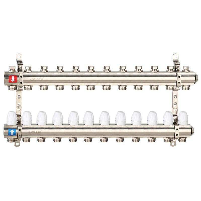 Коллектор регулируемый с запорными клапанами из латуни - 2 загрушки - 2 кронштейна 12-вых. x 1" x 3/4" Gappo G427.12