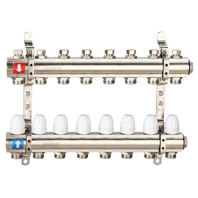 Коллектор регулируемый с запорными клапанами из латуни - 2 загрушки - 2 кронштейна 8-вых. x 1" x 3/4" Gappo G427.8