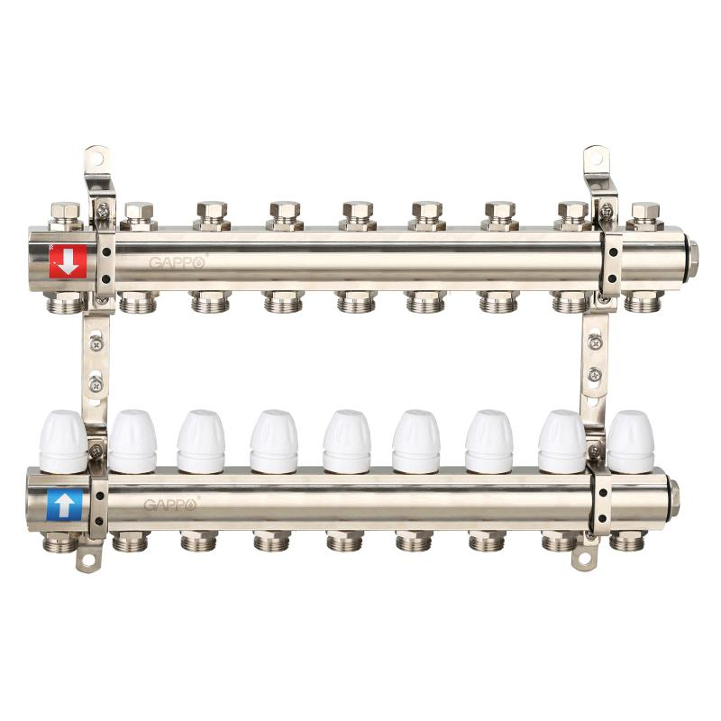 Коллектор регулируемый с запорными клапанами из латуни - 2 загрушки - 2 кронштейна 9-вых. x 1" x 3/4" Gappo G427.9
