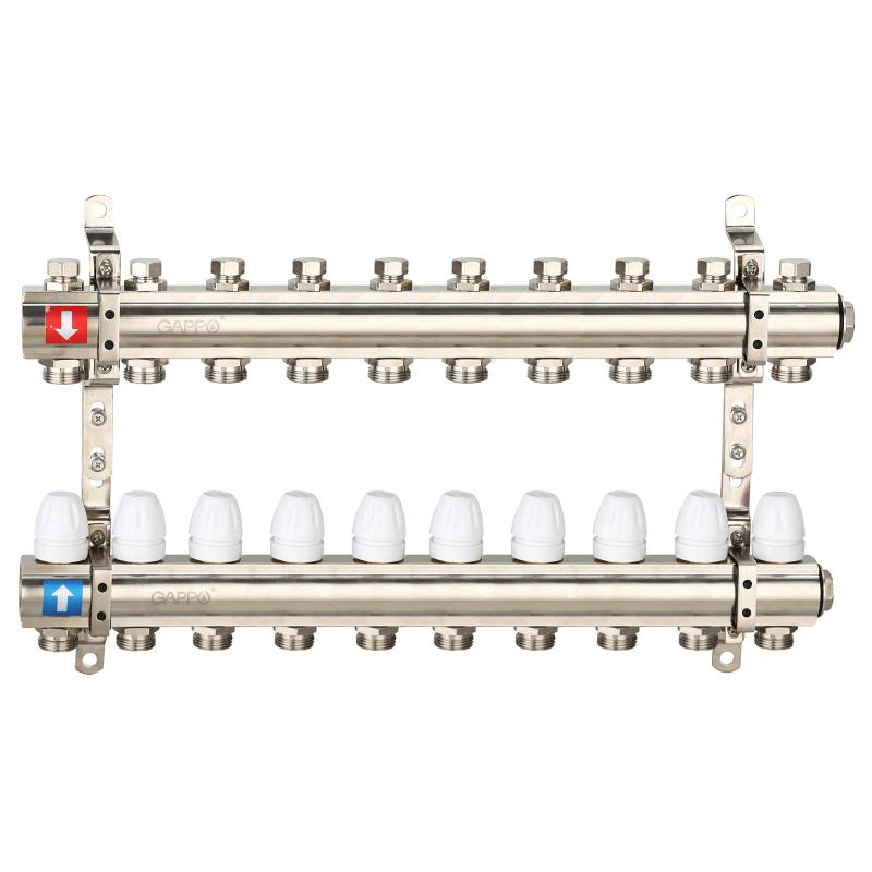 Коллектор регулируемый с запорными клапанами из латуни - 2 загрушки - 2 кронштейна 10-вых. x 1" x 3/4" Gappo G427.10