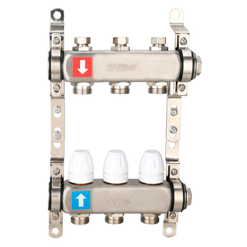 Коллектор регулируемый с запорными клапанами из нержавеющей стали - 2 загрушки - 2 кронштейна 3-вых. x 1" x 3/4" Gappo G428.3