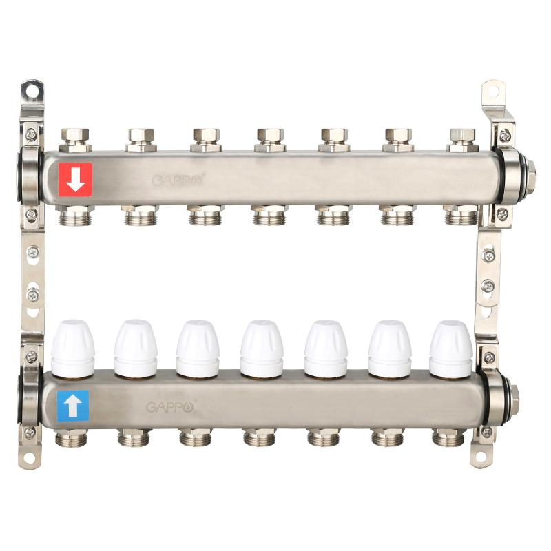 Коллектор регулируемый с запорными клапанами из нержавеющей стали - 2 загрушки - 2 кронштейна 7-вых. x 1" x 3/4" Gappo G428.7