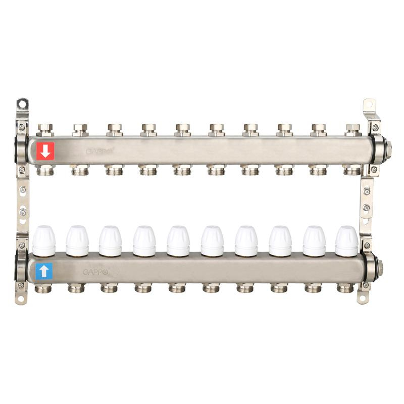 Коллектор регулируемый с запорными клапанами из нержавеющей стали - 2 загрушки - 2 кронштейна 10-вых. x 1" x 3/4" Gappo G428.10