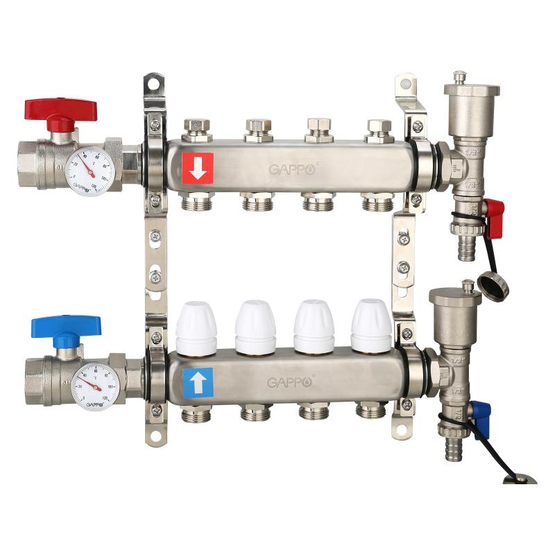 Коллектор регулируемый с запорными клапанами из нержавеющей стали - 2 шаровых крана с термометром - 2 воздухоотводчика - 2 сливных крана - 2 кронштейна 4-вых. x 1" x 3/4" Gappo G426.4