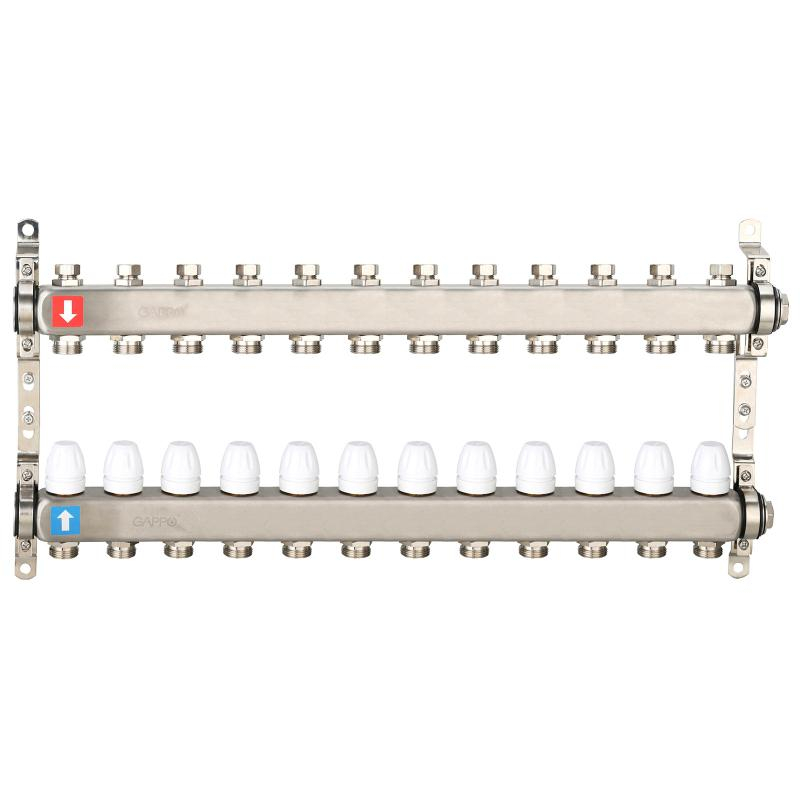 Коллектор регулируемый с запорными клапанами из нержавеющей стали - 2 загрушки - 2 кронштейна 12-вых. x 1" x 3/4" Gappo G428.12
