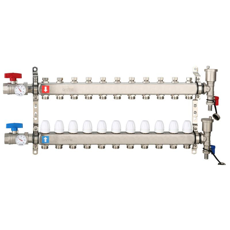 Коллектор регулируемый с запорными клапанами из нержавеющей стали - 2 шаровых крана с термометром - 2 воздухоотводчика - 2 сливных крана - 2 кронштейна 11-вых. x 1" x 3/4" Gappo G426.11