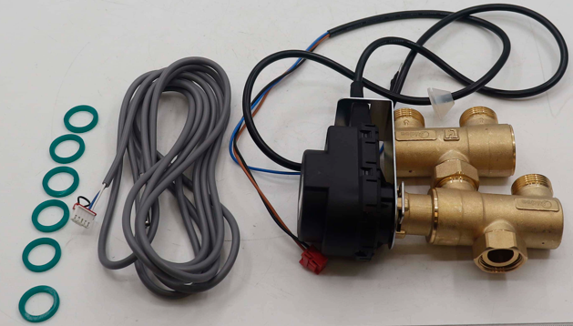 Комплект включает: трёхходовой клапан с электроприводом, датчик температуры ГВС для бойлера косвенного нагрева (10кОм), крепёж, уплотнение, инструкцию.