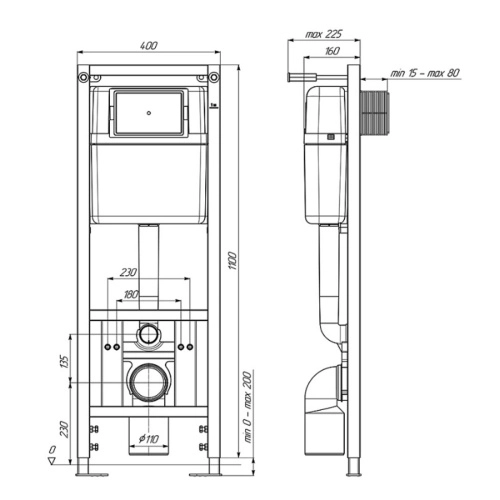 Технические характеристики системы скрытой установки подвесного унитаза WC1010: Максимальная статическая нагрузка, не более - 400 кг. Размеры инсталляции (В х Ш х Г) мм. - 1100–1300 (регулируемая) х 400 х 160-225 (регулируемая). Стандартное межосевое расстояние для крепления подвесного унитаза - 180 мм или 230 мм (совместимо с любой моделью унитаза). Двухкнопочный режим смыва, с возможностью регулировки объема полного слива.