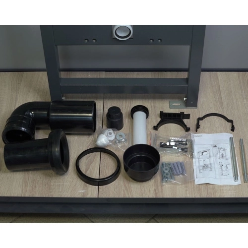 Комплектация: Металлическая рама с нижними и верхними крепёжными элементами; Пластмассовый смывной бачок в сборе (без кнопочного комплекта); Комплект переходных трубок; Комплект крепления инсталляции; Заглушка для трубы 50 мм; Заглушка для трубы 110 мм; Картонный заводской короб; Паспорт с инструкцией по монтажу и эксплуатации.