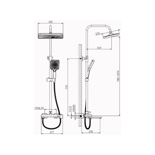 Комплектация: смеситель, верхний душ, душевая лейка, держатель душевой лейки, шланг, стойка