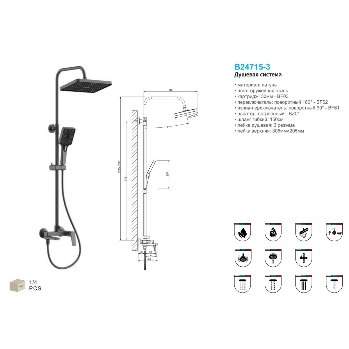 Главная Интернет-магазин Сантехника Смесители и комплектующие Душевая система с изливом BELZ B24715-3 верхний душ, лейка, оружейная сталь (4)