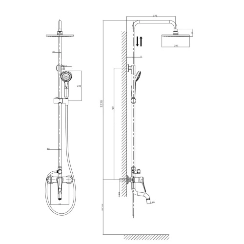 В комплекте 1- режимная душевая лейка, 1-режимный тропический душ, изготовленный из современной прочной пластмассы с никель-хромированным покрытием, душевая штанга, держатель душевой лейки, душевой шланг с латунными гайками 150см, смеситель, индивидуальный пакет, паспорт, гарантийный талон