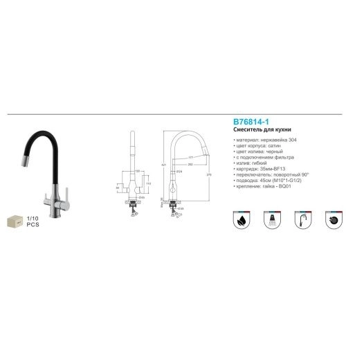 Смеситель для кухни BELZ B76814-1 с подключением к фильтру питьевой воды, корпус сатин, излив черный (10)