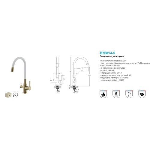 Смеситель для кухни BELZ B76814-5 с подключением к фильтру питьевой воды, корпус золото, излив белый (10)