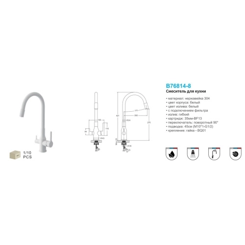 Смеситель для кухни BELZ B76814-8 с подключением к фильтру питьевой воды, белый (10)
