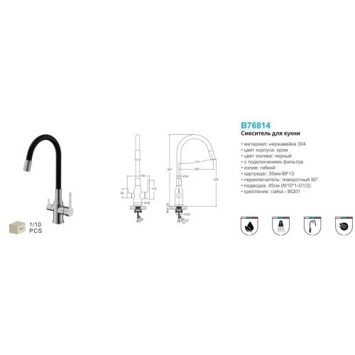 Смеситель для кухни BELZ B76814 с подключением к фильтру питьевой воды, корпус хром, излив черный (10)