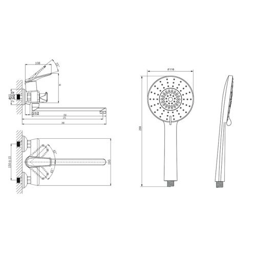 В комплекте универсальная присоединительная группа для установки на вертикальную поверхность, однорежимная душевая лейка и душевой шланг длиной 1,5м., держать душевой лейки, нержавеющие эксцентрики фум-лента, индивидуальный пакет, паспорт, гарантийный талон.