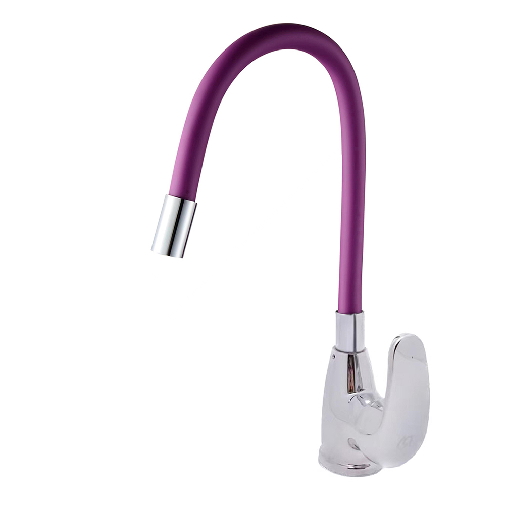 Однозахватный смеситель ROEGEN RG014L для кухни с боковым расположением ручки, на гайке, с гибким лиловым изливом.