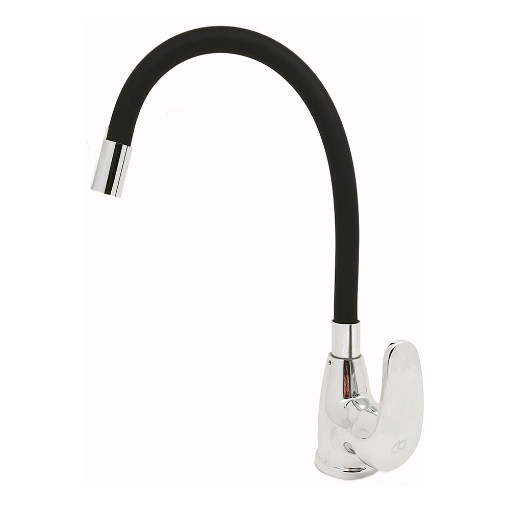 Однозахватный смеситель ROEGEN RG014N для кухни с боковым расположением ручки, на гайке, с гибким черным изливом.