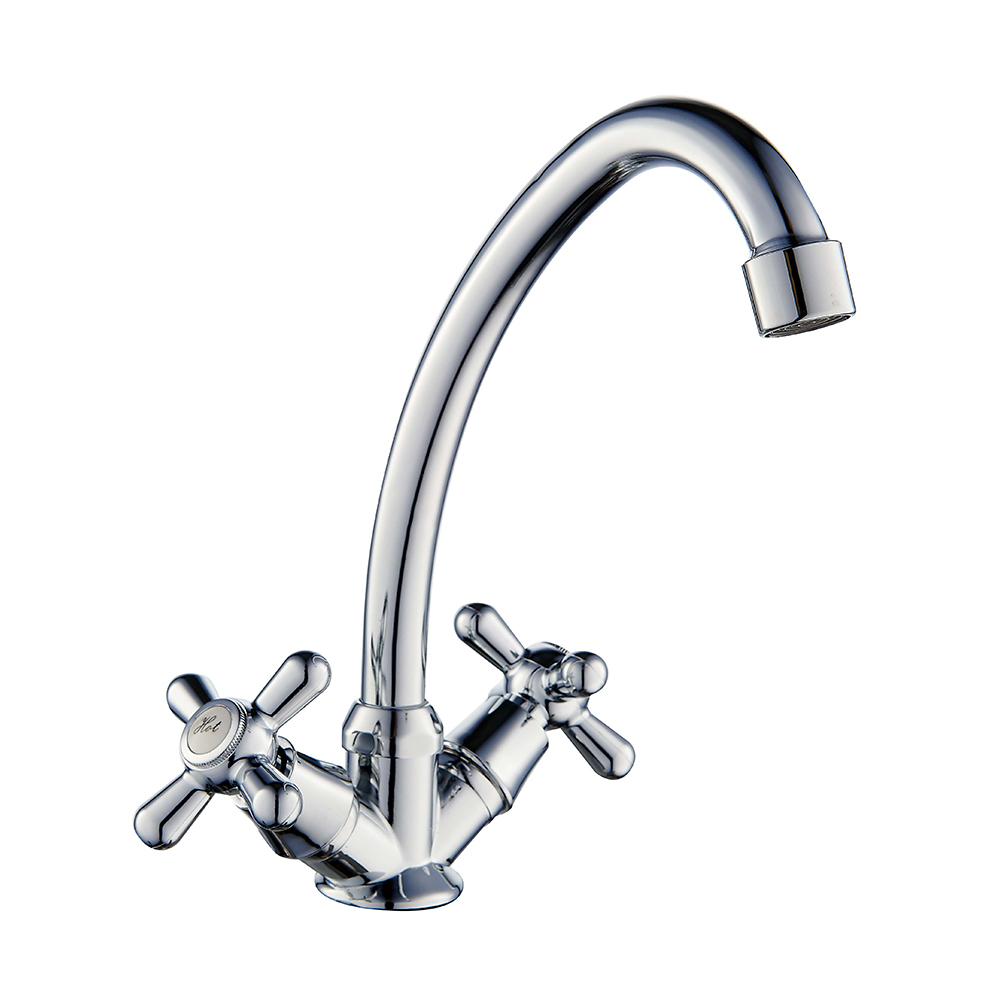 Двухзахватный смеситель ROEGEN RP021A для кухни с крестообразными пластиковыми маховиками типа "P" и вертикальным трубчатым изливом.