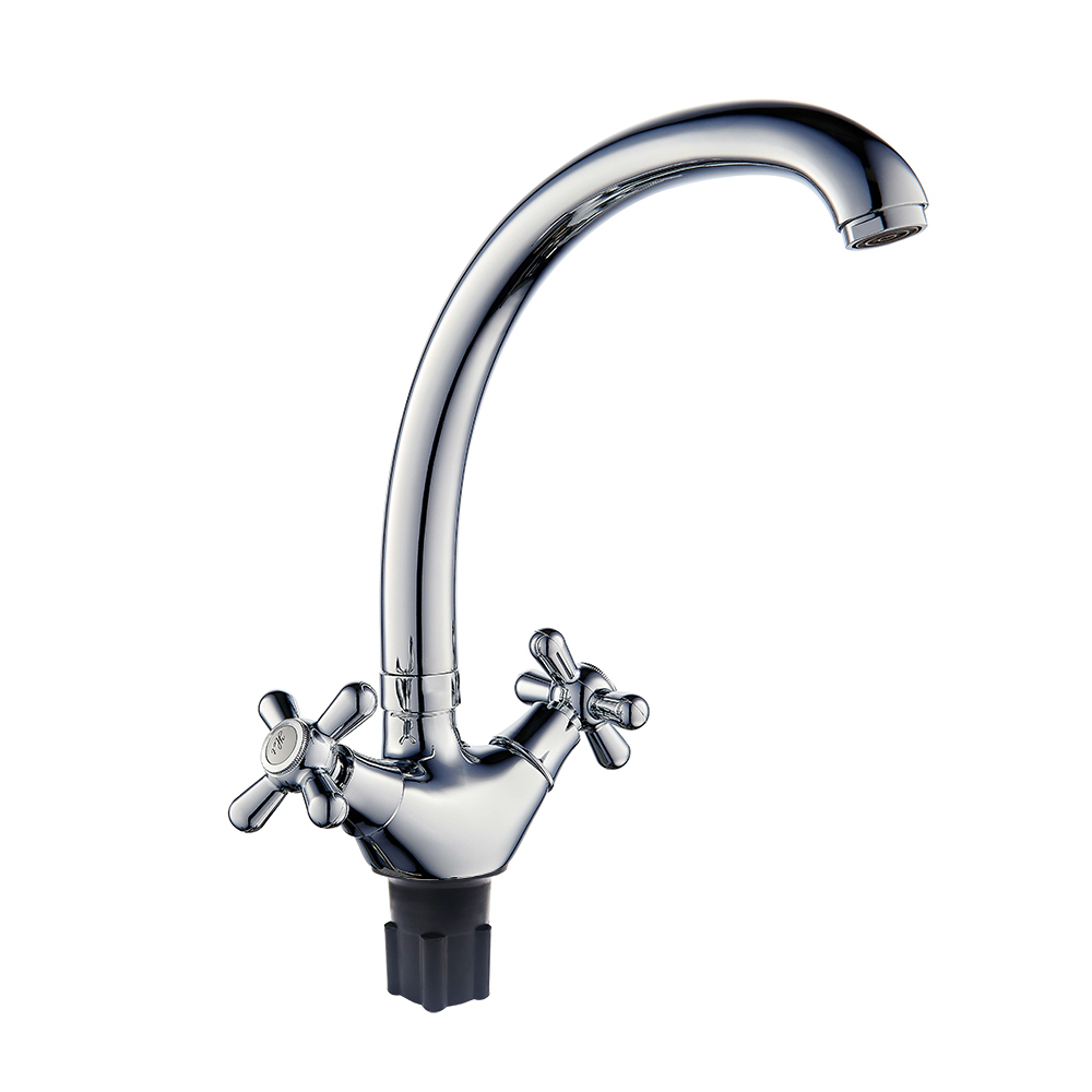 Двухзахватный смеситель ROEGEN RP024B для кухни с крестообразными пластиковыми маховиками типа "P", усиленным корпусом и вертикальным объемным изливом.