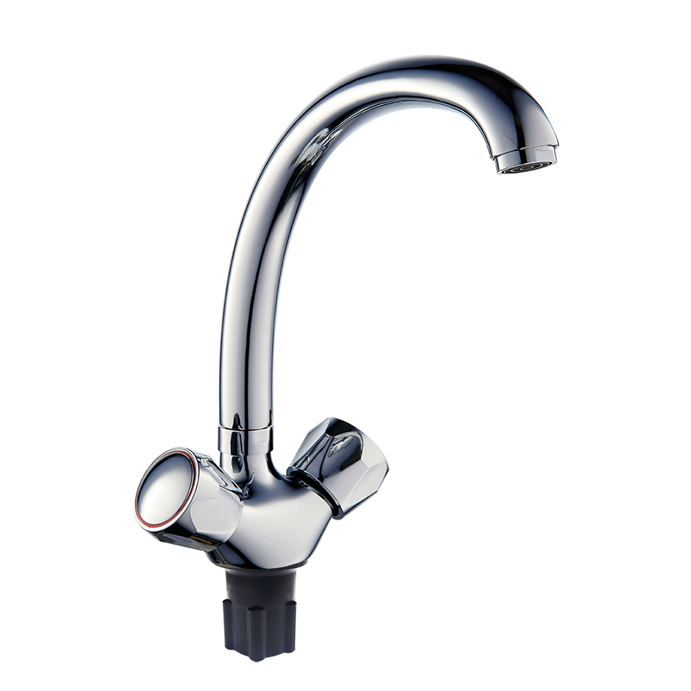 Двухзахватный смеситель ROEGEN RR024B для кухни с округлыми пластиковыми маховиками типа "R", усиленным корпусом и вертикальным объемным изливом.
