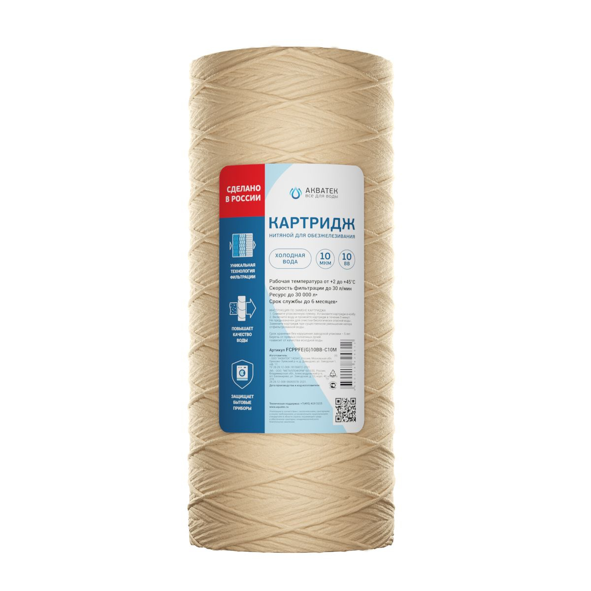 Главная Интернет-магазин Водоподготовка Сменные картриджи Картридж нитяной Акватек 10" BB для обезжелезивания 10 мкм